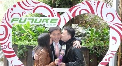 昨天,台北市长郝龙斌前往台北国际花卉博览会未来馆,发放“玫瑰花心巧克力”给前一百名排队民众,共度一个浪漫的情人节。其中排队前十名的情侣,还获得与郝龙斌合照的机会。有趣的是,情侣不但彼此亲吻,甚至还站在郝龙斌左右,一起亲郝龙斌,让他也露出腼腆的笑容。 点评:看看笑容就知道,郝龙斌这个“灯泡”当得还真不错。
