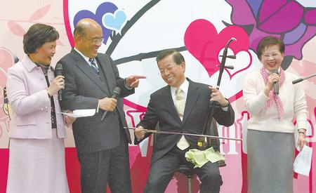 同样是2008年,马英九当时的竞争对手谢长廷也举办了情人节活动,不过人家可不只是秀恩爱,现场还吹拉弹唱,拉二胡、作情诗,借着这个难得的机会展现了一把才艺。 活动现场,谢长廷用二胡演奏了《月亮代表我的心》,他形容自己很浪漫,感激妻子游芳枝一路相挺,接着又即兴创作一首情诗 《我在这里爱你》—— 当我说爱你的时候,风中的松树,吟诗般的叶子,轻轻唱出你的名字:芳枝。 点评:这位大叔,人长得不咋的,花样倒是挺多的。