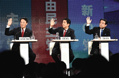 11月29日,日本东京,安倍晋三(中)代表执政党自民党参加党首辩论。日本将于下月14日举行众议院大选投票,获得过半数议席的政党将赢得政权。