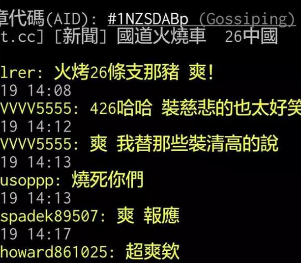 更何况,24名大陆同胞在旅行车内被活活烧死——一个令人闻之落泪的人间惨剧,居然成了台湾某些人炒作仇恨、对立和冷漠的平台!有人说:死了26个,简称426,“死阿陆”,天意;有人说:火烤26条支那猪,爽!他们甚至忘了:惨死的26人中,除了24名大陆人,还有2名台湾人!