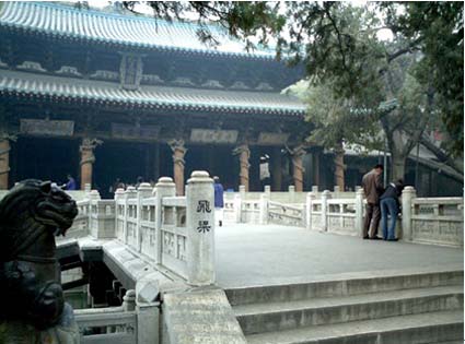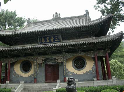 晋祠宋代道教宫观。在山西省太原市西南的晋祠内。圣母殿为祠内主要建筑,坐西向东,位于中轴线终端。是为奉祀姜子牙的女儿,周武王的妻子,周成王的母亲邑姜所建。创建于北宋天圣年间(公元1023年一1032年),崇宁元年(公元1102年)重修,是我国宋代建筑的代表作。殿面阔七间,进深六间,重檐歇山顶,黄绿色琉璃瓦剪边,殿高19米。屋顶板覆盖黄绿琉璃瓦剪边,有明代更换的琉璃花脊兽装饰。殿基依山而建,殿身四周设围廊,廊深两间。前檐曩有木雕盘龙柱八根,盘龙鳞爪有力,盘曲自如,工艺精巧。要盘龙柱之制,在隋唐时多见于造像碑神龛倚柱和石塔门的依柱上,而圣母殿的木构盘龙柱是我国现存最早的盘龙柱,也是宋代《营造法式》“副阶周匝”制的实例,殿内采用减柱法,即殿内无柱,梁架露明。