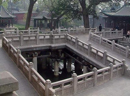 古人以圆形为池,方形为沼,此方形池中多鱼,所以取名鱼沼。至于所谓“飞梁”,本着“架桥为座,若飞也”、“飞梁石磴,陵跨水道”的说法,这是晋水的第二源流,沼上架十字形板,桥沼内立三十四根约30厘米见方的小八角形石柱,柱头卷杀,柱顶架斗拱与横梁,承托着十字形桥面(具体做法为柱上交以着柏枋,上置大斗,斗上是十字相交,乃以承接梁、额),就是飞梁。