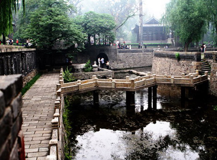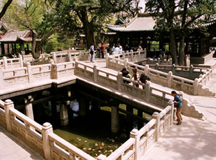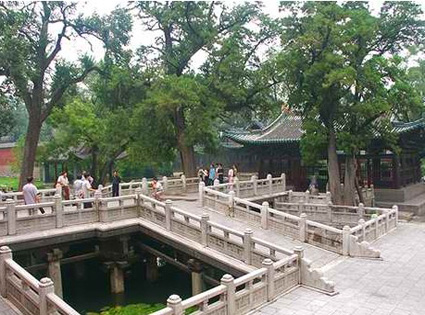 鱼沼飞梁位于山西省太原市区西南的晋祠圣母殿前的水池上,是一座精致的古桥建筑,四周有勾栏围护可凭依。该桥始建于北魏时期,与圣母殿同建,距今已有1500多年的历史,整个梁架都是宋代的遗物。这种十字形桥也是我国现存古桥梁中的孤例。