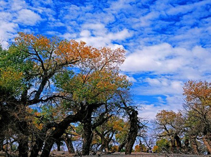 在沙漠公路旁,有一胡杨林公园,在此登高,可眺望壮观的沙漠油田和昼夜燃烧的沙漠火炸。一路行,一路看。