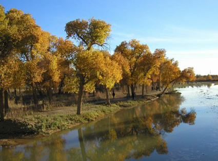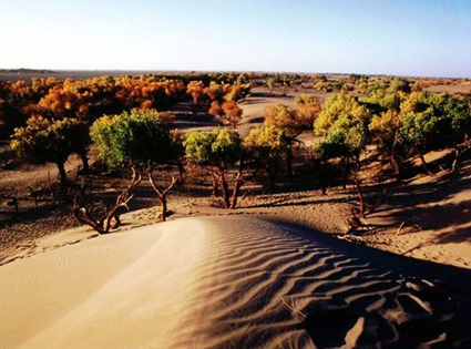 枯死一片,成活另一片,胡杨树间有沙丘,是否还在继续推进?勿晓得。还有两棵著名的胡杨树,不得不提。它们的确是身材出众,不同凡响。是子母树还是雌雄数现在已经记不清楚了。