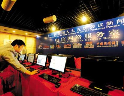 2月26日,在全国“两会”新闻中心电信网络服务室,工作人员在调试网络。当日,设在北京西长安街北侧梅地亚中心的全国“两会”新闻中心正式开展工作。新华社记者 燕雁/摄