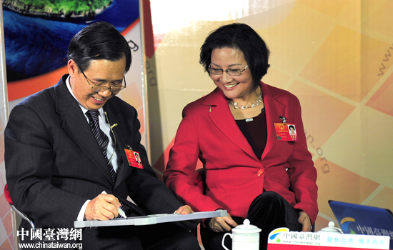 中国台湾网3月11日北京消息 9日,正在参加十一届全国两会的台籍代表陈蔚文、陈云英做客中国台湾网,畅谈履职感受。两位代表分别写下“认真履职,为两岸和平发展献计谋策”和“筚路蓝缕、再创辉煌”的字句,并表示,无论能否于明年连任全国人大代表,都将继续为两岸关系发展、为台胞权益尽绵薄之力。(记者 田云鹏)