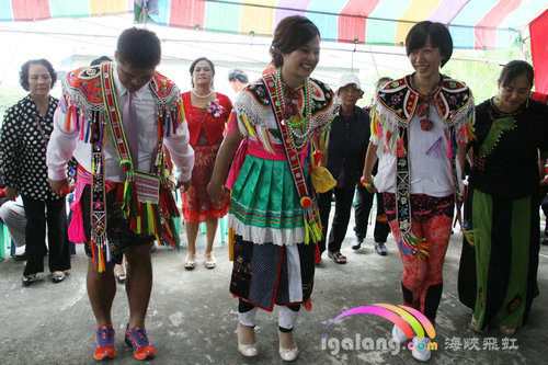 主持人被热情的阿美族新娘拉上,与大家一起载歌载舞