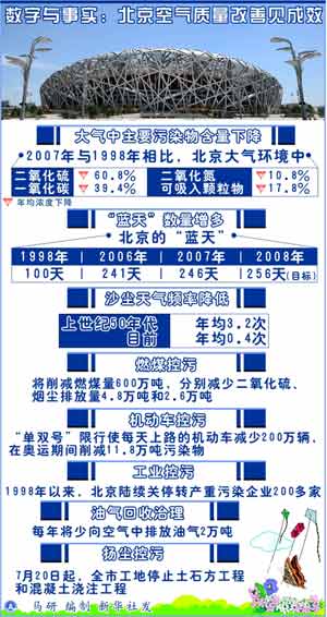 北京的“蓝天”,从1998年的100天增加到2006年的241天,翻了一番多;2007年的“蓝天”数为246天,比2001年申奥成功当年提高了15·6%。今年,北京“蓝天”数量的目标256天,占全年的70%。