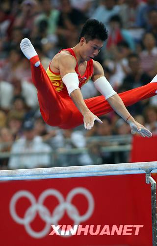 8月19日,中国选手李小鹏在双杠决赛中。当日,中国选手李小鹏在国家体育馆进行的北京奥运会体操男子双杠决赛中以16.450分的成绩夺得冠军。 新华社记者林慧摄