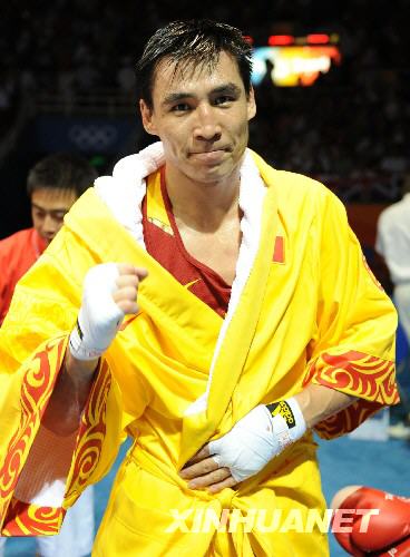 8月22日,中国选手张小平获胜后庆祝。当日,在北京奥运会男子拳击81公斤级半决赛中,中国选手张小平战胜哈萨克斯坦选手叶尔克布兰·西纳利耶夫,晋级决赛。 新华社记者陈燮摄 (资料图片)