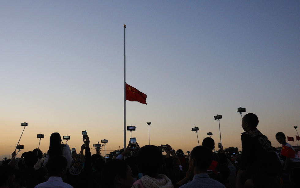 国庆长假第二天,游客纷纷用“自拍神器”和手机拍摄天安门广场降旗仪式。