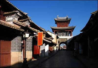 巍山古城建于明洪武二十三年(1390年),已有六百多年的历史。当你走入古城,映入眼帘的是青瓦白墙、木雕大门、黑底鎏金的招牌、舒适清新的石板路。街道上的房子,底层一律是店铺,临街的门面都是木质的。小店的主人,悠悠地坐在草墩上,也不在乎身边的铺子是否有生意。三五成群的老人们悠闲地坐著,围著小方桌吃茶下棋吹牛,看街上的热闹。古街上,背著书包的、挑著蔬菜的、提著鸟笼的、甩著空手的……人们从古楼的门洞穿梭而过,来来往往行走于古街上。岁岁年年,热闹的景象似乎在这古街上定格。