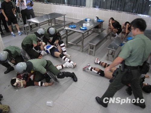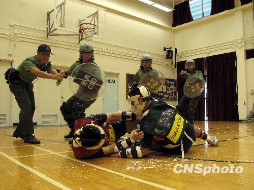 香港惩教职员训练院八月十四日向媒体演示惩教人员处理暴力囚犯的模拟训练。两名“囚犯”打篮球时因碰撞引发殴斗,惩教职员喝止无效后,采取行动迅速制服该起暴力事件。惩教署介绍,运用科学训练的自卫术和防暴控制等技巧,可在制止暴力事件时减少人员受伤及情绪影响。