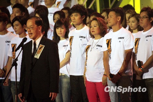 八月十七日晚,香港举办《8·8水灾关爱行动》演唱会,香港民政事务局局长曾德成在讲话。 中新社发 张勤 摄
