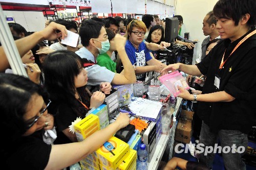 八月二十一日,香港一连四日的电脑通讯节在湾仔会展揭幕。有参展商以低于市场价格促销电子产品,吸引不少人光顾。 中新社发 谭达明 摄
