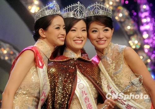 全港瞩目的选美盛事二00九香港小姐竞选决赛二十二日晚圆满结束。芳龄二十三岁的刘倩婷(中)胜出,荣登港姐冠军宝座。亚军是李姿敏(右),熊颖诗夺得季军(左)。 中新社发 邓庆乐 摄