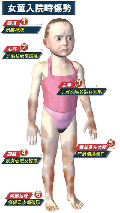 据案情透露,事主现年五岁,而去年底开始受虐时仅四岁。她在今年2月8日被送往联合医院抢救,四肢均出现肿胀。臀部、左大腿、两脚板底、手指、手背均有多处伤痕和溃疡。医生发现女事主头发稀疏、耳朵等处出现表皮脱落,并且出现营养不良导致的贫血及血白蛋白减少症。