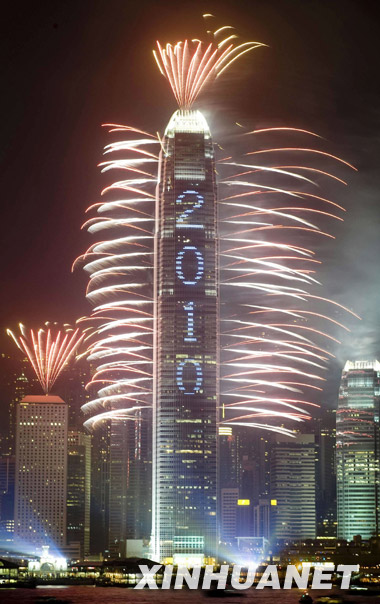 1月1日凌晨,香港维多利亚港举行迎新年烟花灯光汇演,庆祝2010年元旦的到来。新华社记者吕小炜摄