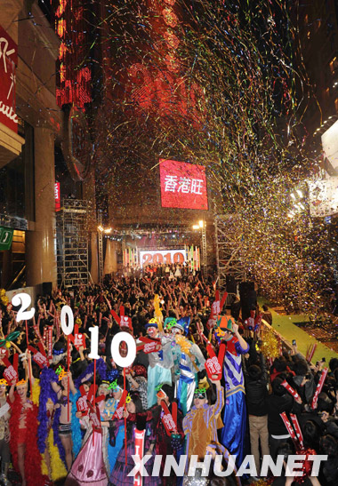 1月1日凌晨,参加庆典的人群欢呼新年的到来。香港民众在时代广场举行“爱香港迎2010”倒计时大派对,共同迎接新年的到来。新华社记者陈铎摄