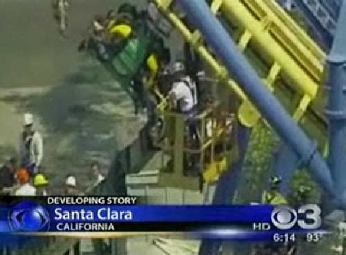 事故发生在加州圣塔克拉拉市的美国主题公园(Great AmericaThemePark)。据该市消防部门官员奥吉·威德曼介绍,当地时间中午12点15分,过山车载着兴奋的游客向整个轨道的最高点进发,“就在即将要上爬的时刻突然停了下来”。