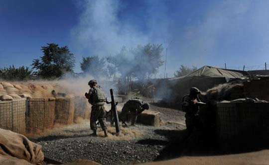 20日,阿富汗的卢格尔省至少有6个投票中心遭到武装分子袭击。图为美军士兵向袭击投票中心的武装分子发射迫击炮。