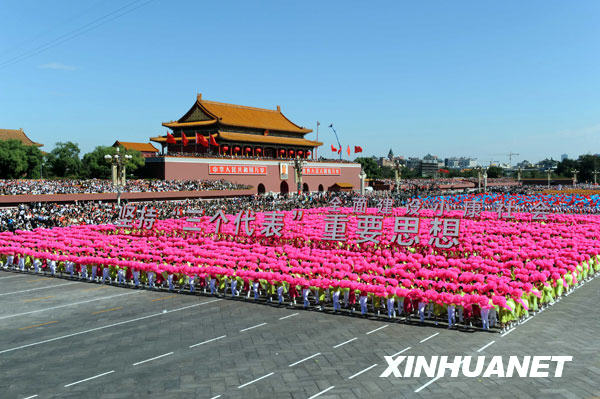 10月1日,首都各界庆祝中华人民共和国成立60周年大会在北京举行。新华社记者陈树根摄 这是“与时俱进”标语方阵通过天安门广场。