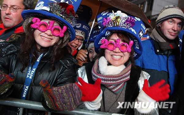 2009年12月31日,两名女子在美国纽约时报广场参加迎新年庆典。当晚,逾百万民众来到纽约时报广场参加新年倒计时活动,欢庆2010年的到来。时报广场的迎新年活动已有百余年历史,是全球最隆重的新年庆典之一。新华社记者刘欣摄