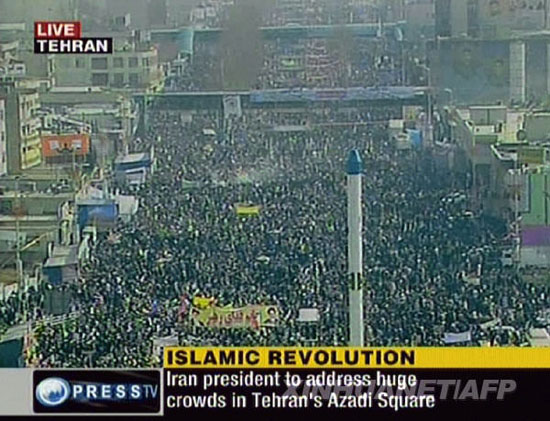 这张2月11日伊朗电视台的电视截图显示,数十万伊朗民众在德黑兰的自由广场集会,庆祝伊斯兰革命胜利31周年。1979年2月1日,领导伊朗伊斯兰革命的霍梅尼结束流亡生涯返回伊朗,巴列维王朝政权在2月11日倒台,伊朗伊斯兰革命取得胜利。新华社/法新
