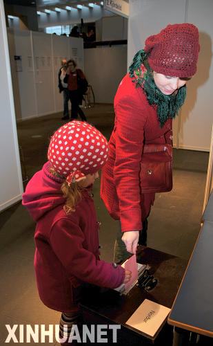 3月6日,在冰岛雷克雅未克,一名妇女带着孩子在市政厅投票站投票。冰岛当日就赔偿英国和荷兰储户损失的议案启动全民公决。 新华社记者和苗摄