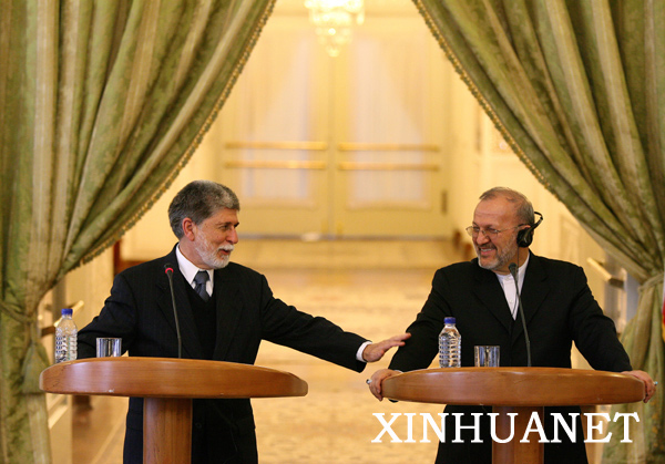 4月27日,在伊朗首都德黑兰,伊朗外长穆塔基(右)与到访的巴西外长阿莫林举行联合记者会。穆塔基表示伊朗希望在不远的将来实施核燃料交换方案,阿莫林则重申了巴方反对对伊朗实施进一步制裁的立场。阿莫林当日抵达德黑兰开始对伊朗进行为期两天的访问。新华社发(哈拉比萨斯摄)