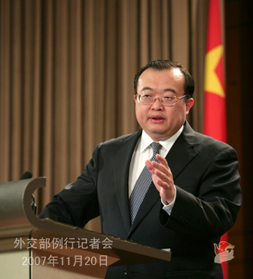 2007年11月20日,外交部发言人刘建超举行例行记者会,就中日韩、中日、中欧领导人会晤,东盟签署《东盟宪章》,巴拉迪伊核问题报告等答记者问。