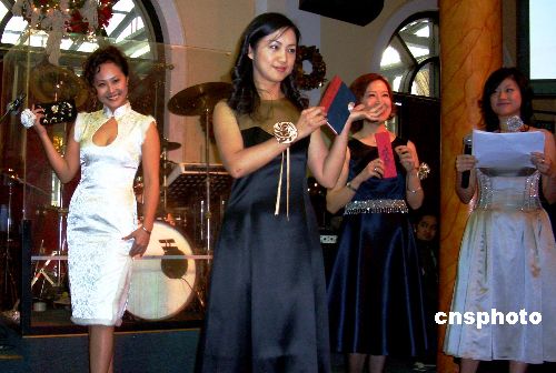 资料图片:上海台商圈内富有盛名的“一八八一”台湾职业女性联谊会举办盛大的圣诞慈善“走秀”活动,为内地贫困女童募集善款。图为一群台商太太身着盛装登上T台,展示爱心义卖的小礼物,轰动全场。 中新社发 许晓青 摄