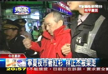 呛扁也在台北发生!陈水扁23日晚间到台北宁夏夜市吃蚵仔面线,“红衫军自主公民协会”会长林正杰和几位“红衫军”成员在街口透过广播高喊“阿扁下台”,警方赶紧前往处理,并将林正杰带离现场。
