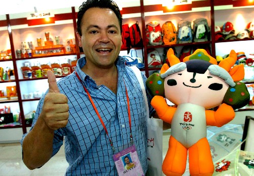 10月29日,一名来自危地马拉的客商在第102届中国进出口商品交易会(广交会)展馆中拿起中国制造的奥运吉祥物福娃连连夸好。虽然不久前中国玩具在美国遭遇召回风波,但在此次广交会上,中国玩具、尤其是奥运吉祥物福娃仍然受到外商青睐。中国玩具制造商更加注重产品质量和安全性,出口价格普遍上涨。 新华社记者 壮锦 摄