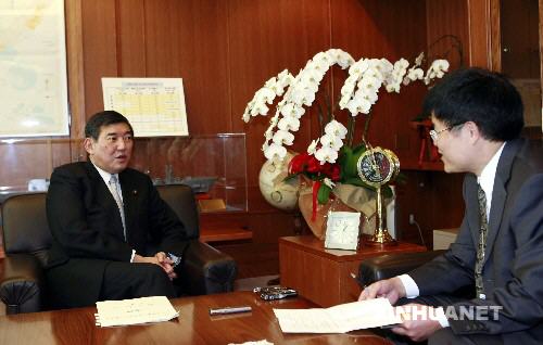 11月26日,日本防卫大臣石破茂(左)在东京防卫省办公室接受新华社记者专访,就中国海军军舰访问日本及两国间的军事、防务交流等回答记者提问。 新华社记者任正来摄