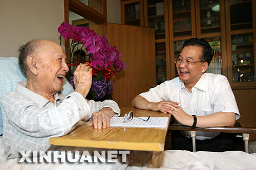 资料图片:2007年8月3日,中共中央政治局常委、国务院总理温家宝来到钱学森家,看望这位96岁的“国家杰出贡献科学家”。钱学森是我国航天科学的奠基人之一。 新华社记者 黄敬文摄