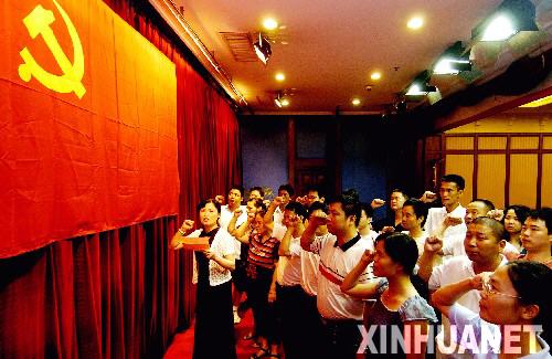 6月29日,加入党组织的福州市非公企业新党员在党旗下宣誓。当日,福州市100名非公企业优秀青年光荣加入党组织。今年以来,福建省加强非公企业党组织建设,全省8708家规模以上企业全部建立党组织,一批优秀青年加入到党组织的行列,成为经济建设和社会发展的生力军。 新华社记者 张国俊 摄