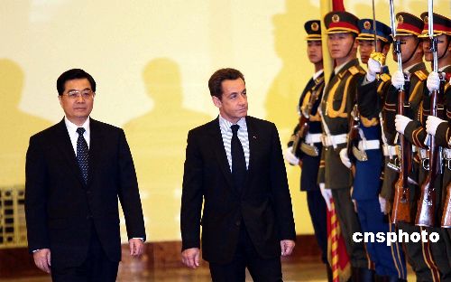 十一月二十六日,中国国家主席胡锦涛在北京人民大会堂举行仪式欢迎来访的法国总统萨科奇。 中新社发 盛佳鹏 摄