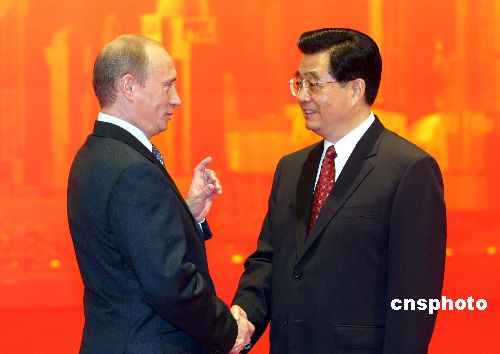 六月十五日,上海合作组织成员国元首理事会第六次会议在上海开幕。图为中国国家主席胡锦涛欢迎俄罗斯总统普京参会。 中新社发 廖文静 摄