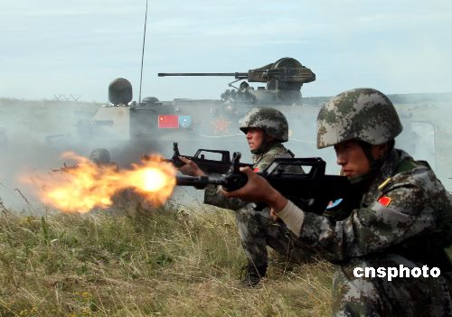 8月15日,参加“和平使命——2007”上海合作组织武装力量联合反恐军事演习的中方参演部队,进驻切巴尔库尔演习场以来,进行紧张的分练、合练和重点课目的训练。图为中方参演官兵对目标进行射击。 中新社发 张雷 摄