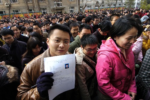 12月9日,在南京林业大学考点参加国家公务员招录考试的考生们进入考场。当日,2008年中央机关及其直属机构公务员招录考试公共科目笔试在全国31个省、市、自治区同时进行。此次考试江苏省安排了南京主考区和无锡、徐州、扬州3个分考区,共设32个考点,1366个考场,考生总数为38667名,人数创历年之最。 新华社记者 孙参 摄