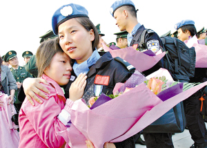 上午8时整,一架中国国际航空公司CF6-80C2专机稳稳地降落在白云机场停机坪,一面鲜红的标有“中国维和警察防暴队”旗帜首先从机舱门飘出,紧接着,95名胸前佩戴联合国“和平勋章”的维和队员依次走下悬梯,已经等候多时的家属、战友们立即冲了上去,当维和队员王胜抱起4岁的儿子王子天时,实在忍不住红了眼圈,因为上次抱起儿子时,这个小家伙才3岁。