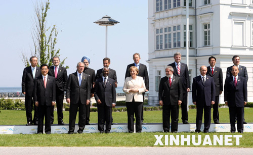 6月8日,国家主席胡锦涛在德国海利根达姆出席八国集团同发展中国家领导人对话会议。这是会后与会领导人合影留念。 新华社记者鞠鹏摄
