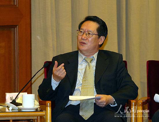 中国人寿保险集团公司原副总经理苗复春在座谈会上发言。