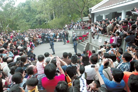 资料图片:两蒋陵寝12月24日起暂停对外开放,驻守的军队将在明年 元旦撤哨,23日为开放的最后一天,许多民众高举相机拍下历史画面。(图片来源:台湾《中国时报》)