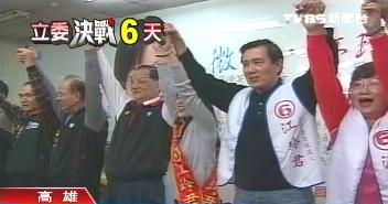 据台湾“中广新闻”报道,“立委”选举前夕最后一个超级星期天,连战特地南下高雄县为4名国民党“立委”候选人吴光训、江玲君、锺绍和和林益世站台造势,马英九也再度南下,陪同江玲君和吴光训到眷村扫街拜票。