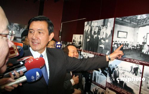 马英九在特展开幕式上客串导览,介绍展览中的历史照片。