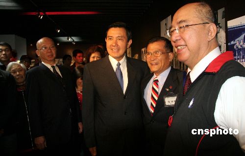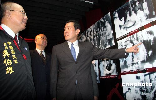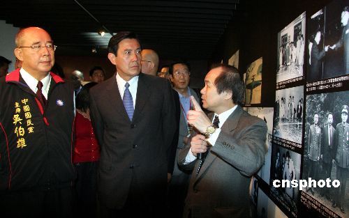 一月九日,为纪念蒋经国先生逝世二十周年,由中国国民党主办的“台湾路——蒋经国的旅程”文物特展在台北原国民党中央党部中正展览厅开幕。中国国民党主席吴伯雄(左)、国民党二○○八年“大选”参选人马英九(中)等出席特展开幕式并参观展览。 中新社发 孙自法 摄