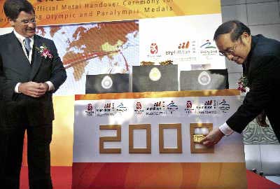 北京奥组委文化活动部部长赵东鸣(右)在交接仪式上将金属材料安放在写有2008字样的横幅上。